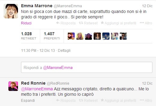 Il settimanale “Oggi” non ha dubbi. Il tweet al vetriolo postato qualche giorno fa da Emma Marrone sarebbe diretto al fidanzato Marco Bocci. ““Non si gioca con due mazzi di carte, soprattutto quando non si è in grado di reggere il gioco. Si perde sempre!”, dice la cantante salentina gettando nella preoccupazione i suoi fan. Lo stesso Red Ronnie, amico della vincitrice di “Amici”, si insospettisce e commenta: “Azz messaggio criptato, diretto a qualcuno…me lo metto tra i preferiti. Un giorno lo capirò”.
