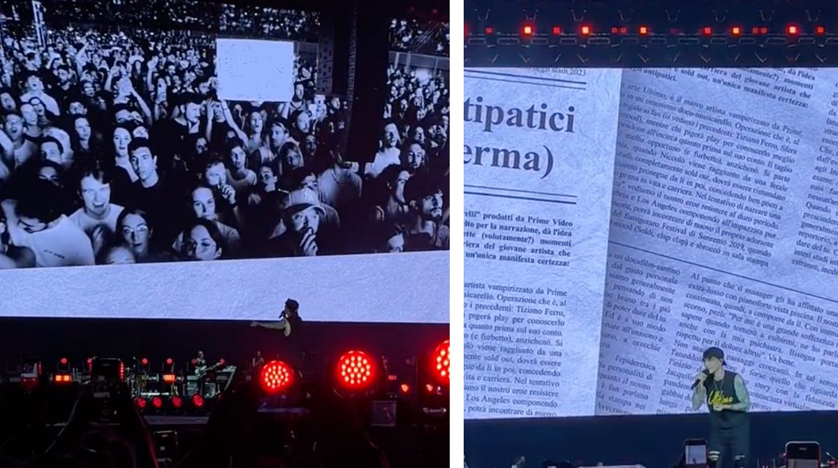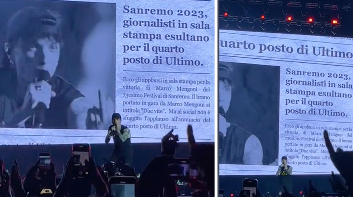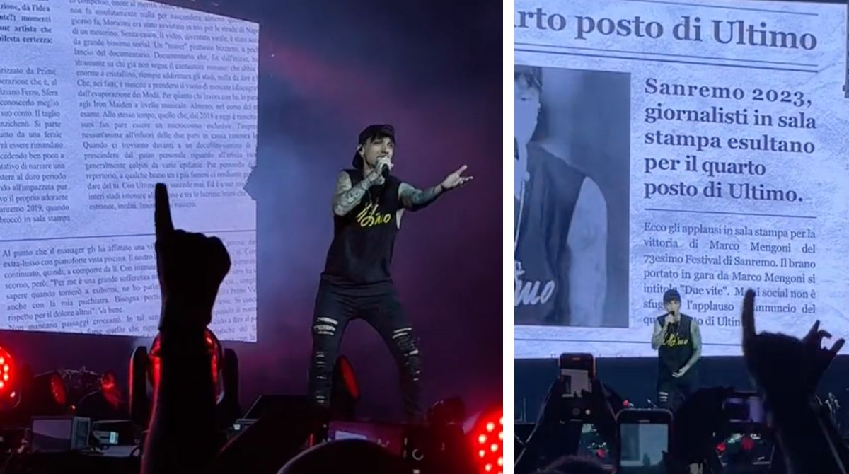 Non si può dire che Ultimo sia uno che dimentica facilmente. Nonostante il grande successo di vendite e pubblico che continua ad ottenere, il cantautore di San Basilio pensa ancora a Sanremo. La delusione per il quarto posto ottenuto nell’ultima edizione è ancora cocente. Niccolò Moriconi, vero nome di Ultimo, non dimentica neanche i battibecchi avuti con i giornalisti. Dopo il successo straordinario dell’anno scorso, quest’estate Ultimo ha programmato le date del suo tour e le tre romane sono già sold out. La data zero è stata il 1° luglio a Lignano Sabbiadoro, in Friuli-Venezia Giulia, e dal palco ha voluto lanciare un messaggio che è arrivato forte e chiaro. Sulle note di “Canzone Stupida”, in particolare mentre cantava il verso “Posso avere un momento per parlarti con sincerità?”, ha mostrato il dito medio con alle spalle alcuni articoli che parlavano proprio del suo quarto posto a Sanremo 2023.