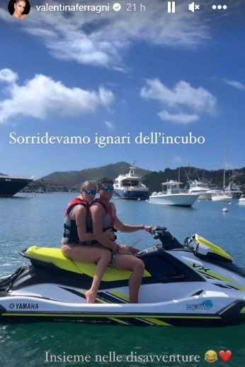 “Vi giuro, uno spavento enorme – ha concluso Valentina Ferragni – In mezzo al mare aperto, da soli, senza nessuno che ci aiutasse. Le moto d’acqua sono veramente pericolosissime. Un’esperienza traumatica! Non salirò più su una moto d’acqua per il resto della mia vita. Mi raccomando, fare attenzione e soprattutto affidatevi a persone valide. Anche la nostra guida sembrava valida, c’erano un sacco di recensioni positive e anche quando ti affidi a persone valide non è detto che poi l’esperienza sia sufficientemente valida”.