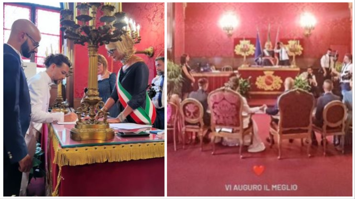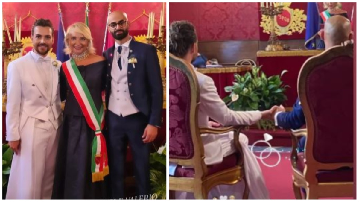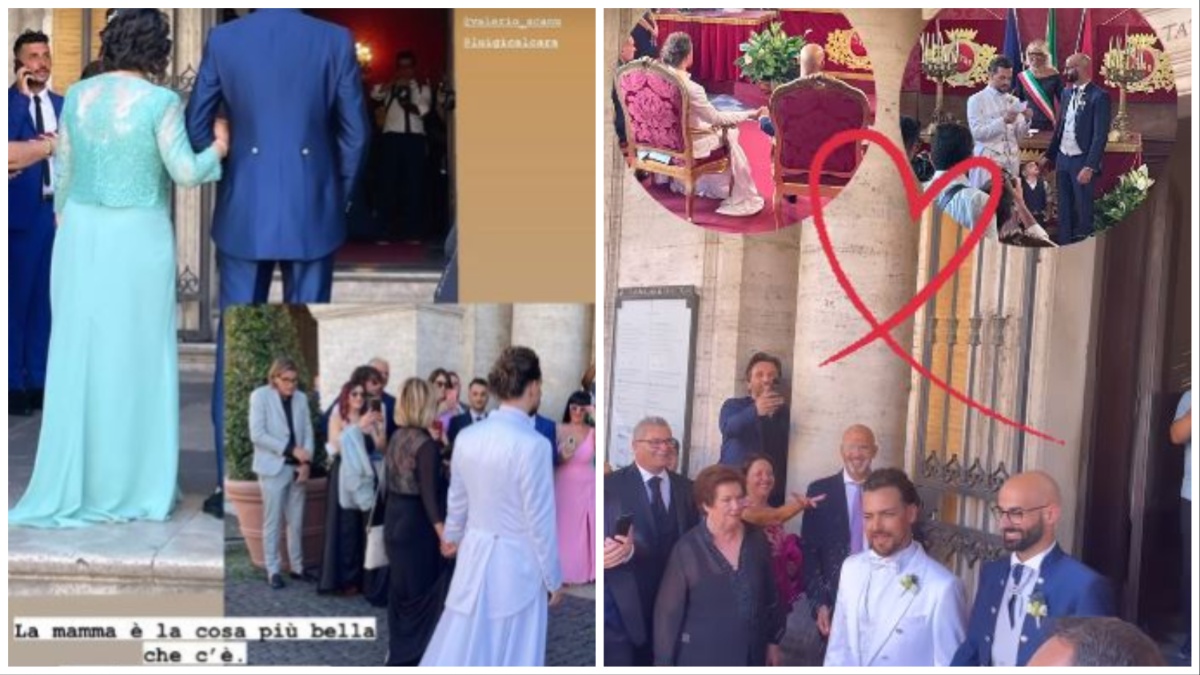 Valerio Scanu e Luigi Calcara si sono uniti civilmente giovedì 7 settembre dopo tre anni d’amore. Il rito, preceduto da una romantica serenata pre matrimonio la sera prima, è stato celebrato dall’amica Silvia Berri, del Comitato elettrotecnico italiano, nella Sala Rossa del Campidoglio dove gli sposi si sono presentati al braccio delle rispettive madri. Il discorso dell’officiante ha commosso i presenti.