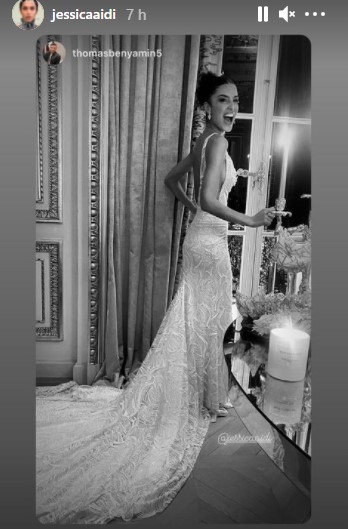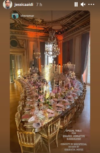 Cambio d’abito per il ricevimento super raffinato ospitato in un esclusivo albergo parigino con menu misto italiano e francese. Per l’occasione, Jessica Aidi ha sfoggiato un abito bianco dalla profonda scollatura sulla schiena e con un lunghissimo strascico. Durante la festa, Carla Bruni ha cantato per gli sposi.