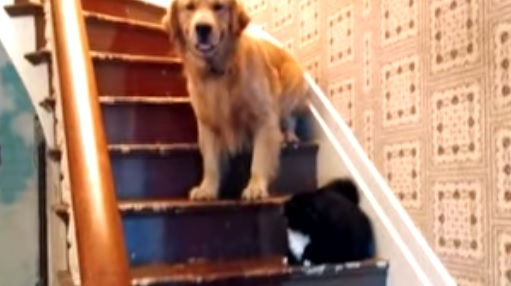 “Da qui non si passa”, il gatto sbarra la strada al cane