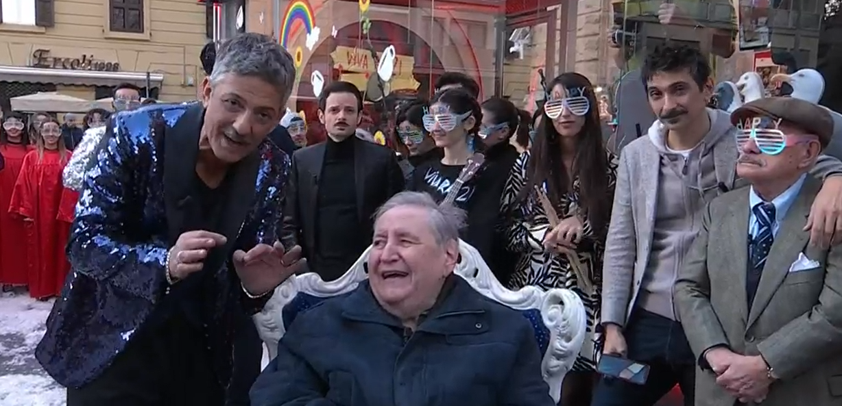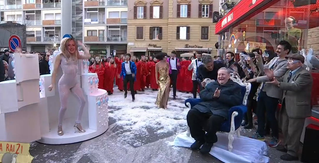 “Auguri Vincenzo, ti vogliamo tanto bene”, ha detto lo showman siciliano visibilmente emozionato. “Festeggiare il mio compleanno con te è un bellissimo regalo”, ha replicato Mollica seduto su una poltrona posizionata in strada davanti al glass box di via Asiago. Sulle note di “Happy Birthday” è partito un coinvolgente balletto e dalla torta (finta) è uscita una ballerina con la maschera del premier Giorgia Meloni.